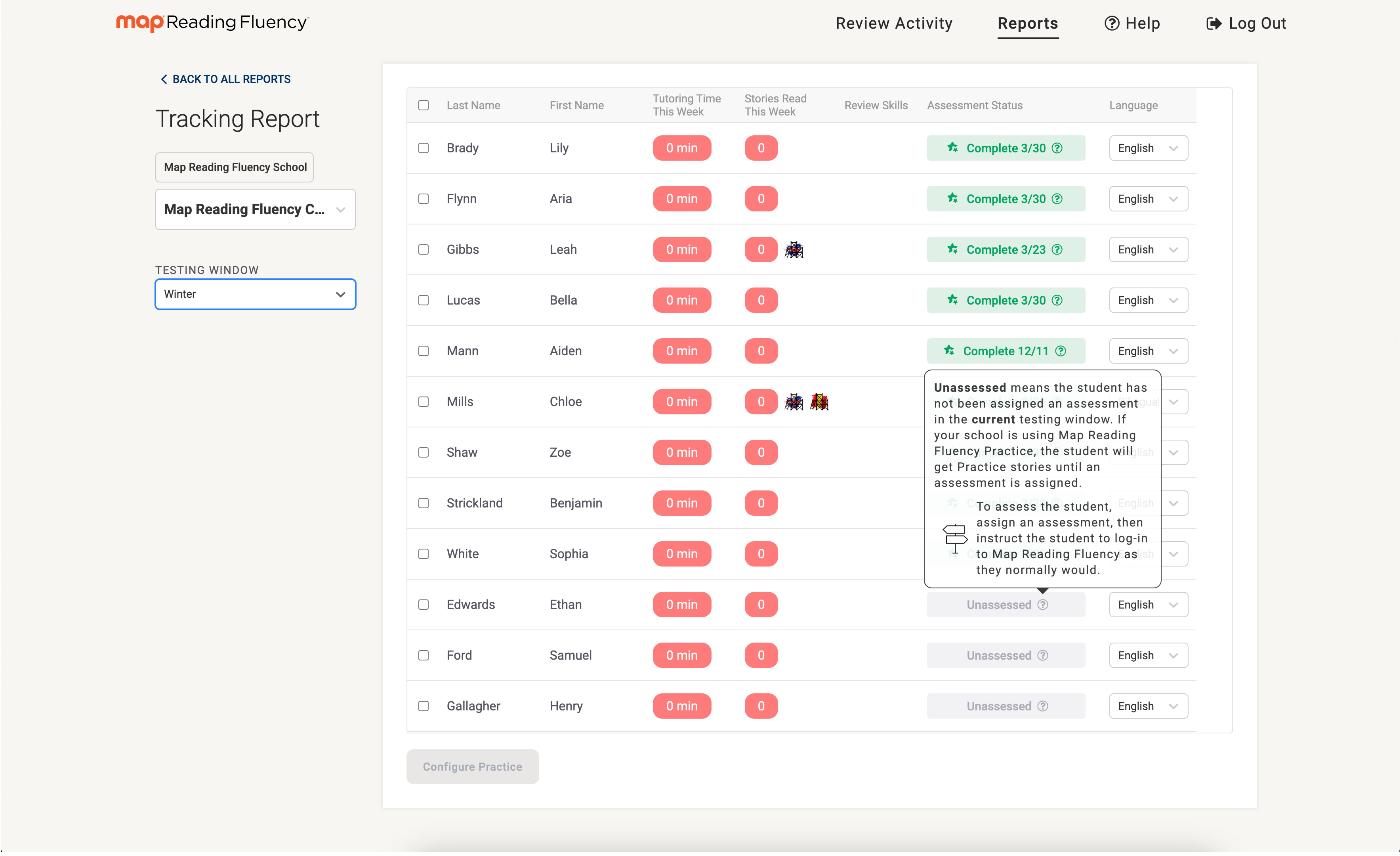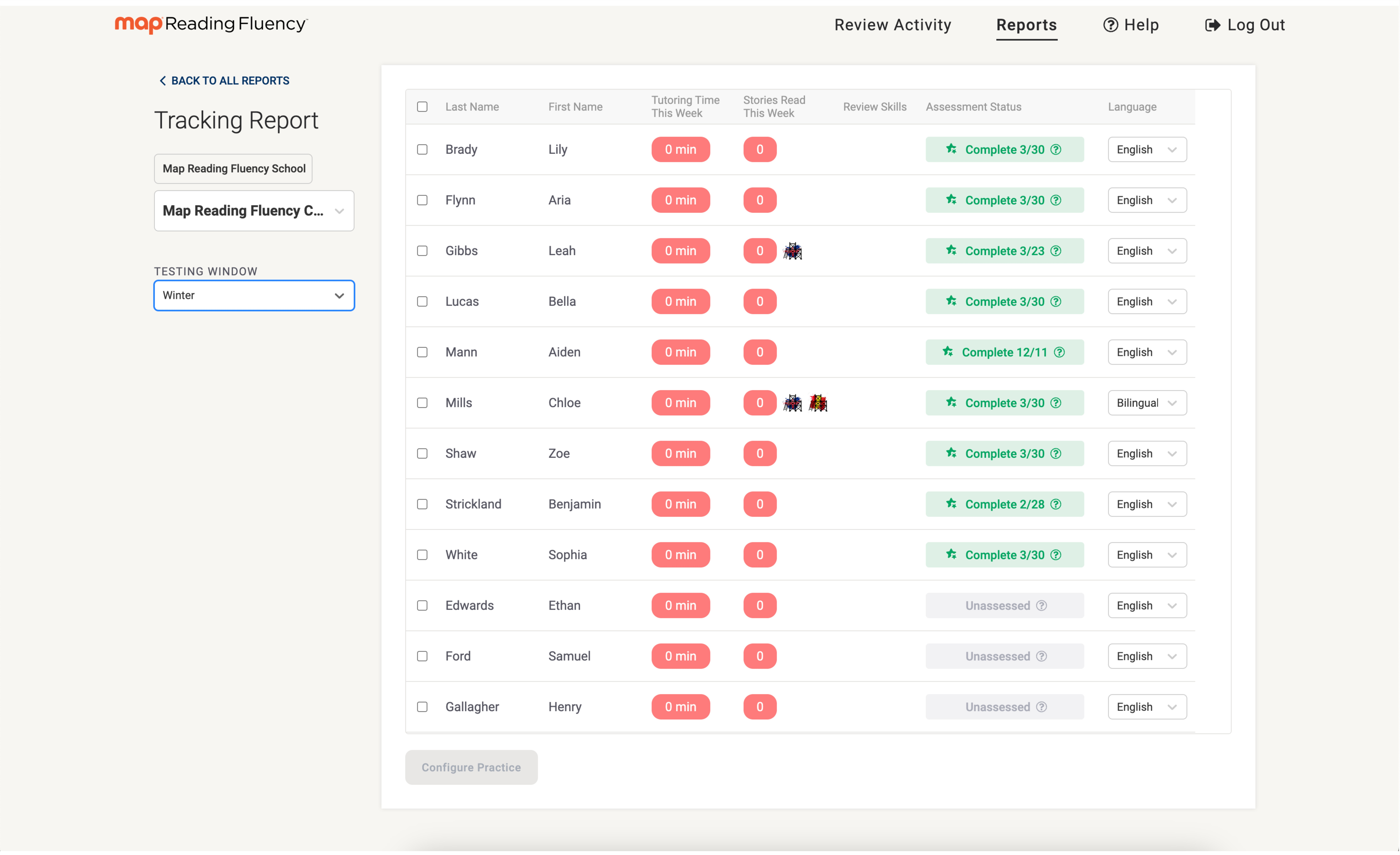 The Tracking Report lets you monitor your students’ MAP Reading Fluency assessment status, designate students as Early Reader and/or bilingual in Spanish, configure students’ practice experience, and more.